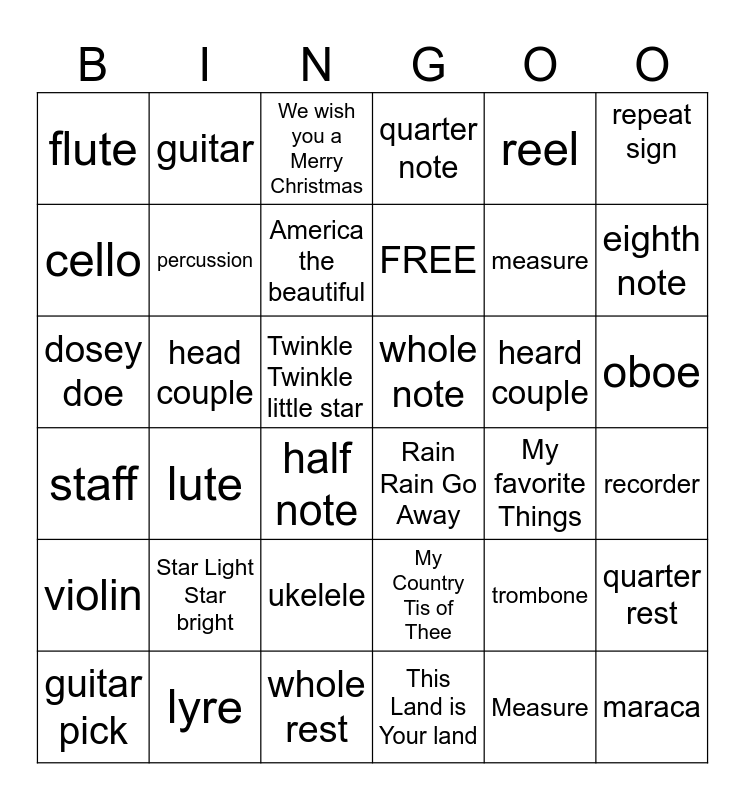 This bingo card has 36 words: My Country Tis of Thee, ukelele, This Land is Your land, cello, staff, whole note, percussion, whole rest, reel, trombone, eighth note, quarter note, quarter rest, head couple, FREE, flute, violin, heard couple, dosey doe, We wish you a Merry Christmas, Twinkle Twinkle little star, lute, Rain Rain Go Away, half note, My favorite Things, guitar, measure, lyre, America the beautiful, repeat sign, maraca, guitar pick, recorder, oboe, Star Light Star bright and Measure.