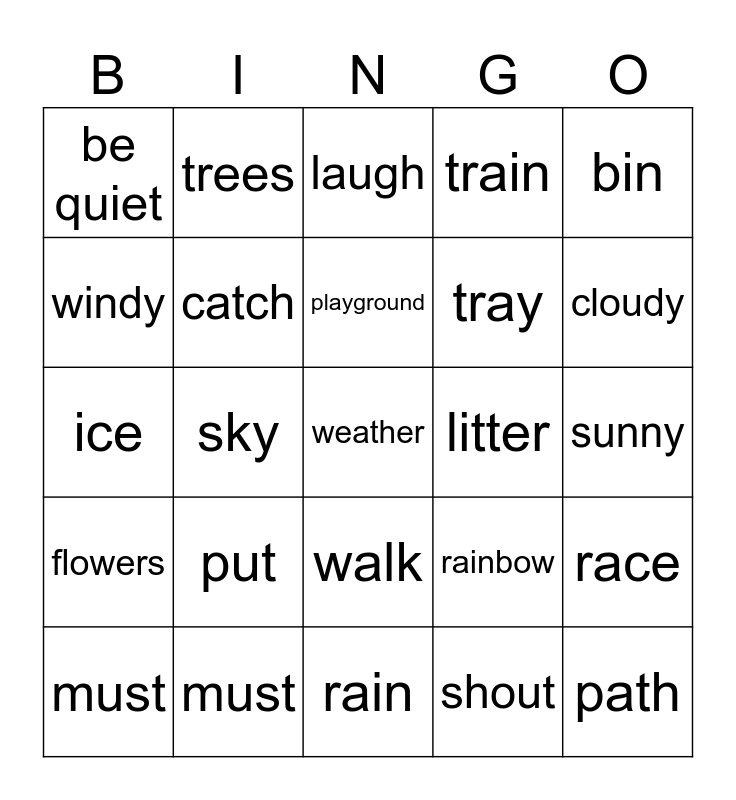 This bingo card has 34 words: path, shout, grass, chase, flowers, catch, bin, must, trees, cross, playground, laugh, fountain, cloud, litter, cloudy, must, ice, put, rainbow, walk, snow, be quiet, sunny, rain, weather, train, wind, tray, windy, case, sky, race and sun.