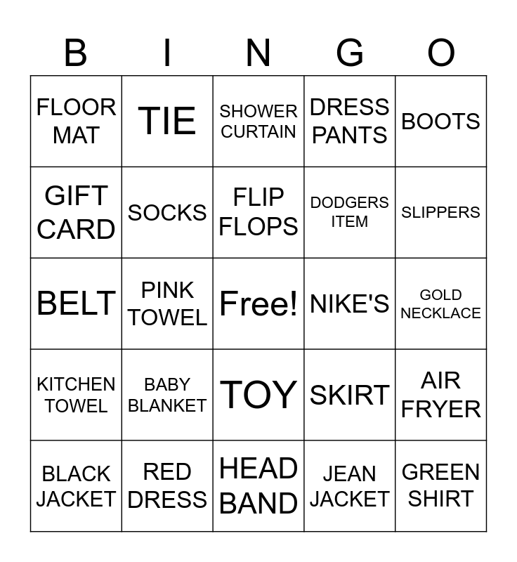 This bingo card has a free space and 29 words: BLACK JACKET, BLUE DRESS, PINK TOWEL, COFFEE MAKER, FLOOR MAT, SHOWER CURTAIN, SOCKS, BABY BLANKET, NIKE'S, RED DRESS, GOLD NECKLACE, GREEN SHIRT, HEAD BAND, JEAN JACKET, SLIPPERS, HAT, TOY, KITCHEN TOWEL, BOOTS, BELT, SKIRT, MICKEY SHIRT, DODGERS ITEM, GIFT CARD, DRESS PANTS, TIE, AIR FRYER, FLIP FLOPS and VANS.