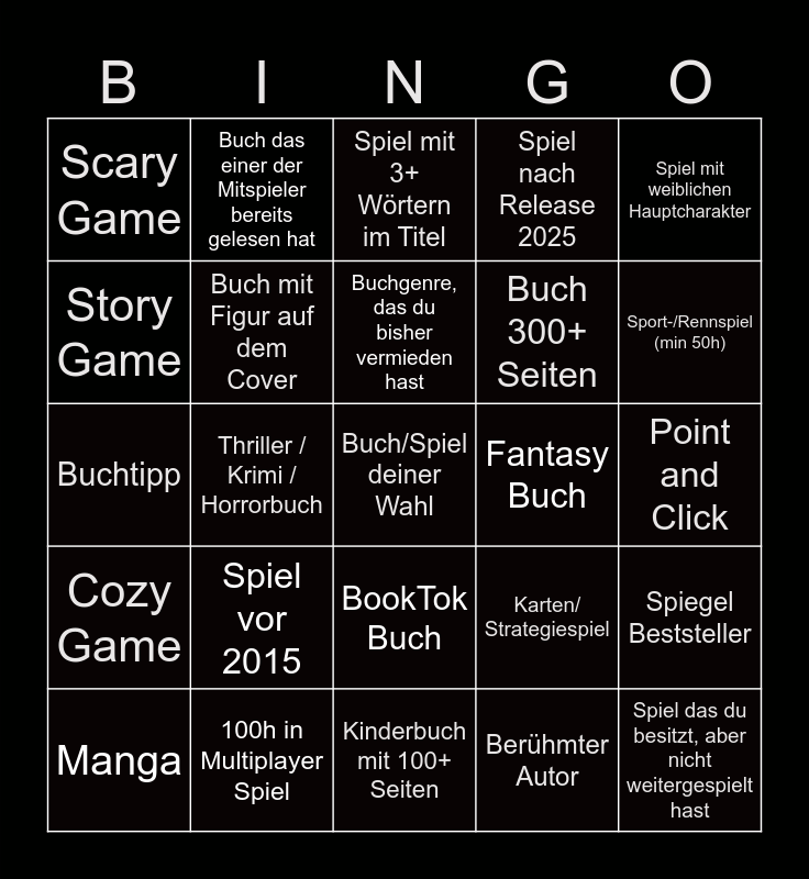 This bingo card has a free space and 24 words: Spiel vor 2015, 100h in Multiplayer Spiel, Buchgenre, das du bisher vermieden hast, Manga, Spiel mit weiblichen Hauptcharakter, Scary Game, Story Game, Buch das einer der Mitspieler bereits gelesen hat, Fantasy Buch, BookTok Buch, Buch 300+ Seiten, Buchtipp, Karten/ Strategiespiel, Spiegel Beststeller, Buch mit Figur auf dem Cover, Berühmter Autor, Point and Click, Spiel mit 3+ Wörtern im Titel, Sport-/Rennspiel (min 50h), Thriller / Krimi / Horrorbuch, Spiel das du besitzt, aber nicht weitergespielt hast, Cozy Game, Spiel nach Release 2025 and Kinderbuch mit 100+ Seiten.