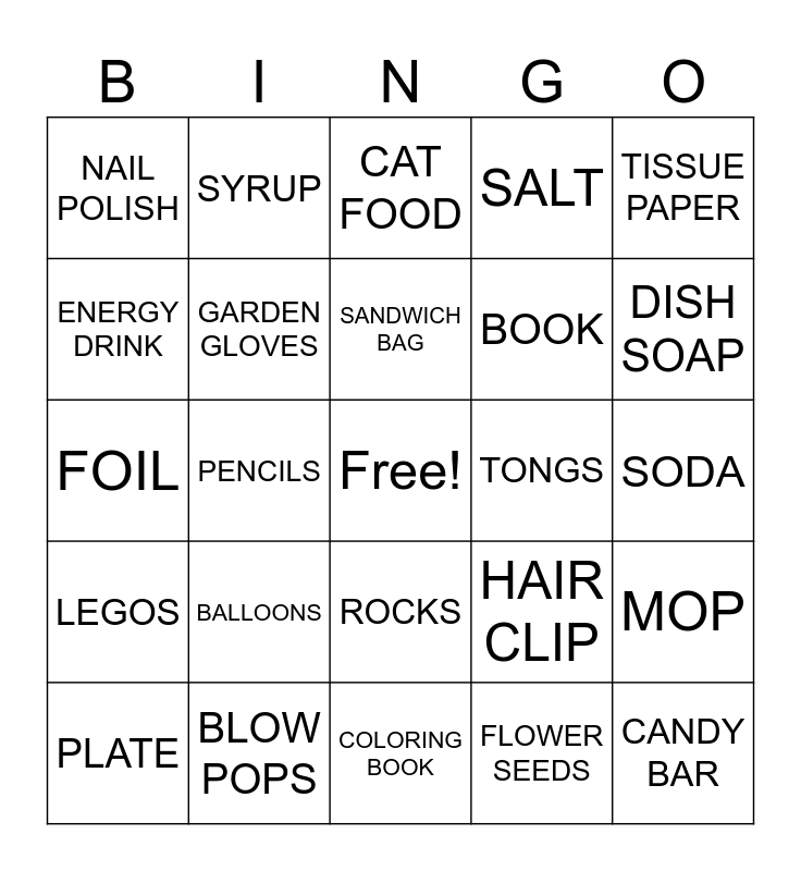 This bingo card has a free space and 29 words: PLATE, STORAGE CONTAINER, PENCILS, STICKERS, NAIL POLISH, CAT FOOD, GARDEN GLOVES, BALLOONS, TONGS, BLOW POPS, SODA, CANDY BAR, COLORING BOOK, FLOWER SEEDS, DISH SOAP, GIFT BAG, ROCKS, LEGOS, TISSUE PAPER, FOIL, HAIR CLIP, DOG BONE, BOOK, ENERGY DRINK, SALT, SYRUP, MOP, SANDWICH BAG and PRETZELS.