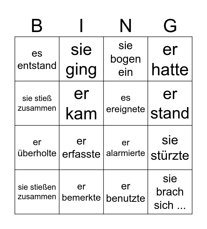 This bingo card has 25 words: er fuhr, sie half, er stand, er übersah, sie stieß zusammen, es entstand, er kam, sie ging, er bemerkte, er lief, er überholte, er alarmierte, sie bremste, sie erlitt, es ereignete, sie stürzte, er benutzte, sie bogen ein, er erfasste, sie stürzte, sie stießen zusammen, er zog sich ... zu, sie brach sich ..., er hatte and sie war.
