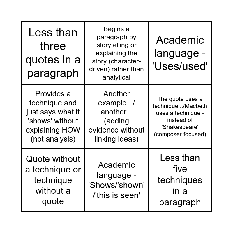 This bingo card has a free space and 8 words: The quote uses a technique.../Macbeth uses a technique - instead of 'Shakespeare' (composer-focused), Academic language - 'Uses/used', Begins a paragraph by storytelling or explaining the story (character-driven) rather than analytical, Quote without a technique or technique without a quote, Less than three quotes in a paragraph, Less than five techniques in a paragraph, Provides a technique and just says what it 'shows' without explaining HOW (not analysis) and Academic language - 'Shows/'shown' /'this is seen'.