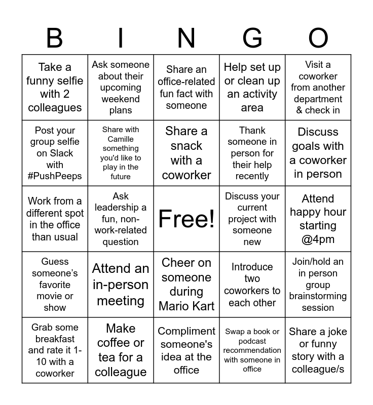 This bingo card has a free space and 25 words: Attend an in-person meeting, Compliment someone's idea at the office, Share a snack with a coworker, Grab some breakfast and rate it 1-10 with a coworker, Visit a coworker from another department & check in, Take a funny selfie with 2 colleagues, Post your group selfie on Slack with #PushPeeps, Ask someone about their upcoming weekend plans, Discuss your current project with someone new, Cheer on someone during Mario Kart, Thank someone in person for their help recently, Work from a different spot in the office than usual, Introduce two coworkers to each other, Join/hold an in person group brainstorming session, Share with Camille something you'd like to play in the future, Play at least one round of Mario Kart, Attend happy hour starting @4pm, Share an office-related fun fact with someone, Discuss goals with a coworker in person, Ask leadership a fun, non-work-related question, Share a joke or funny story with a colleague/s, Make coffee or tea for a colleague, Guess someone’s favorite movie or show, Help set up or clean up an activity area and Swap a book or podcast recommendation with someone in office.