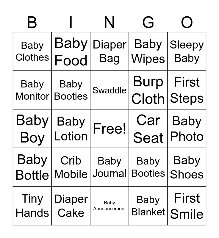 This bingo card has a free space and 60 words: Baby Onesie, Diaper Cake, Pacifier, Baby Bottle, Baby Blanket, Stroller, Baby Booties, Crib, Burp Cloth, Diapers, Baby Wipes, Bottled Milk, Baby Monitor, Baby Shower Cake, Nursery, Baby Clothes, First Smile, Sleepy Baby, Baby Rattle, Swaddle, Car Seat, Diaper Bag, Tiny Hands, Baby Shoes, Bottle Warmer, Baby Bib, Baby Powder, Cuddles, First Steps, Baby Hat, Baby Teeth, Newborn Onesie, Baby Shower Game, Baby Name Reveal, Baby Food, Toy Blocks, Baby Shampoo, Baby Lotion, Baby Girl, Baby Boy, Teething, Crib Mobile, Baby Photo, Baby Snuggles, Baby Booties, Playtime, Baby’s First Word, Baby’s First Bath, Bottle Feeding, Baby Journal, Baby Announcement, Infant Carriers, Baby Swing, Maternity Clothes, First Haircut, Baby Milestones, Baby Tummy Time, Sleepy Time, Baby Shower Favor and Baby Shower Gifts.