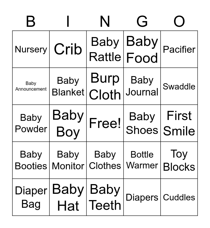 This bingo card has a free space and 34 words: Baby Onesie, Diapers, Stroller, Baby Bottle, Baby Booties, Baby Blanket, Pacifier, Diaper Bag, Crib, Baby Wipes, Burp Cloth, Baby Rattle, Car Seat, Baby Bib, Baby Shoes, Swaddle, Baby Hat, Baby Powder, Baby Monitor, Bottle Warmer, Baby Clothes, Baby Shower Cake, Nursery, First Smile, Baby Teeth, Cuddles, Baby Food, Baby Swing, Baby Journal, Baby Announcement, Baby Girl, Baby Boy, Toy Blocks and Teething.