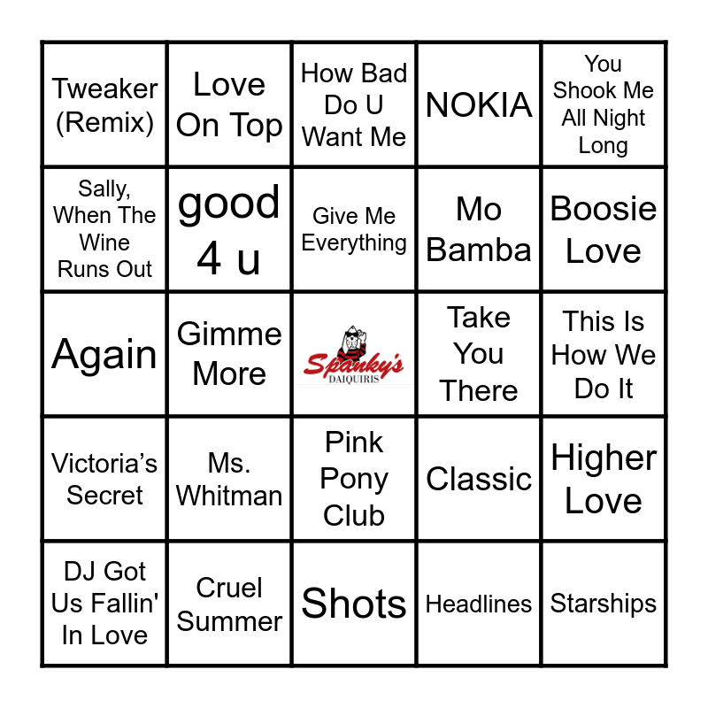 This bingo card has a free space and 88 words: Crazy In Love, I Like It, Pink Pony Club, Forever, You Make Me Feel..., Play Hard, Without You, Swag Surfin', Trap Queen, My House, Sweet Child O' Mine, Tik Tok, Higher Love, This Is How We Do It, Promiscuous, Give Me Everything, Teenage Dirtbag, Stay, FE!N, CARNIVAL, Church Clap, Crank That, Again, She Will, Headlines, HOT TO GO!, That’s So True, I Want You Back, The Giver, Anxiety, How Bad Do U Want Me, NOKIA, Revolving door, Mine, Ms. Whitman, Sally, When The Wine Runs Out, Tweaker (Remix), 1 AM, ACTIN UP, Boosie Love, Gimme More, Get Lucky, Do Ya Think I'm Sexy?, Classic, Take You There, I'm so Paid, Someone to Call My Lover, Applause, Since U Been Gone, Mo Bamba, A-O-K, Sk8er Boi, Easy On Me, What Is Love, Replay, Cruise, Victoria’s Secret, Love On Top, Bulletproof, Boulevard Of Broken Dreams, The Great Escape, California Gurls, Feels, Talking Body, Loose As a Goose, Cruel Summer, My First Kiss, good 4 u, DJ Got Us Fallin' In Love, Starships, Right Thurr, Despacito, Thnks Fr Th Mmrs, You Shook Me All Night Long, Anti-Hero, Can't Stop The Feeling!, Before He Cheats, Gorilla, Shots, STAY, Girls, Throat Goat, Love In This Club, Dangerous, Any Way You Want It, I Don't Want to Miss a Thing, Bad At Love and Our Song.