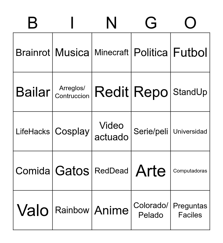 This bingo card has 25 words: Gatos, Anime, Redit, Valo, Futbol, Brainrot, Bailar, Musica, Serie/peli, RedDead, Repo, LifeHacks, Arte, Computadoras, Arreglos/ Contruccion, Preguntas Faciles, Universidad, Minecraft, StandUp, Cosplay, Video actuado, Rainbow, Comida, Politica and Colorado/ Pelado.