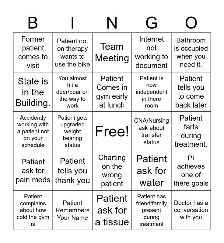 This bingo card has a free space and 24 words: Patient tells you thank you, Patient Remembers Your Name, Patient Comes in gym early at lunch, Patient complains about how cold the gym is, Bathroom is occupied when you need it., Former patient comes to visit, State is in the Building., Patient not on therapy wants to use the bike, CNA/Nursing ask about transfer status, Charting on the wrong patient, Patient is now independent in there room, Accidently working with a patient not on your schedule, Patient ask for water, Pt achieves one of there goals, You almost hit a deer/boar on the way to work, Patient has friend/family present during treatment, Patient farts during treatment., Team Meeting, Patient tells you to come back later, Patient gets upgraded weight bearing status, Doctor has a conversation with you, Patient ask for pain meds, Internet not working to document and Patient ask for a tissue.