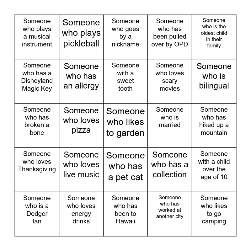 This bingo card has 26 words: Someone who has a pet cat, Someone who has worked at another city, Someone with a sweet tooth, Someone who loves energy drinks, Someone who is the oldest child in their family, Someone who plays a musical instrument, Someone who has a Disneyland Magic Key, Someone who plays pickleball, Someone who has hiked up a mountain, Someone who has a collection, Someone who loves scary movies, Someone who has broken a bone, Someone with a child over the age of 10, Someone who is a Dodger fan, Someone who loves pizza, Someone who has knows how to skateboard, Someone who has been pulled over by OPD, Someone who loves Thanksgiving, Someone who goes by a nickname, Someone who likes to garden, Someone who is bilingual, Someone who has been to Hawaii, Someone who is married, Someone who loves live music, Someone who has an allergy and Someone who likes to go camping.