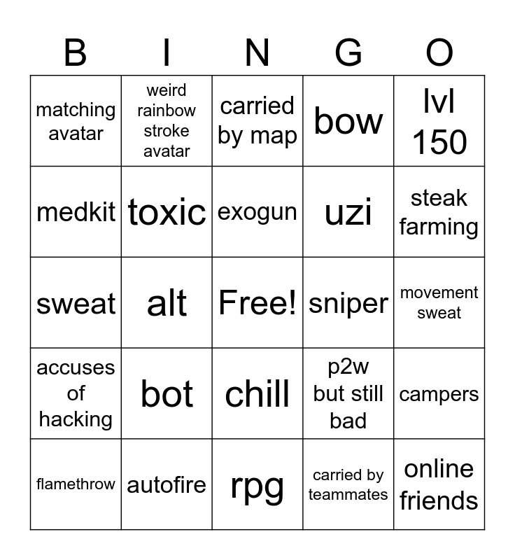 This bingo card has a free space and 30 words: autofire, p2w, alt, sprayer, matching avatar, carried by map, toxic, chill, sniper, rpg, movement sweat, online friends, carried by teammates, anger issues, steak farming, furry, p2w but still bad, accuses of hacking, bot, lvl 150, sweat, horrible map choices, weird rainbow stroke avatar, uzi, medkit, bow, campers, flamethrow, exogun and skins for weapons.