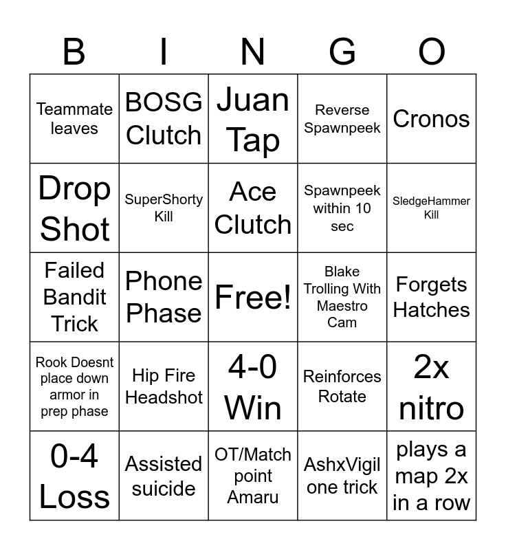 This bingo card has a free space and 24 words: Hip Fire Headshot, Assisted suicide, Ace Clutch, 0-4 Loss, Cronos, Teammate leaves, Drop Shot, BOSG Clutch, Blake Trolling With Maestro Cam, 4-0 Win, Spawnpeek within 10 sec, Failed Bandit Trick, Reinforces Rotate, 2x nitro, SuperShorty Kill, AshxVigil one trick, Forgets Hatches, Juan Tap, SledgeHammer Kill, Phone Phase, plays a map 2x in a row, Rook Doesnt place down armor in prep phase, Reverse Spawnpeek and OT/Match point Amaru.