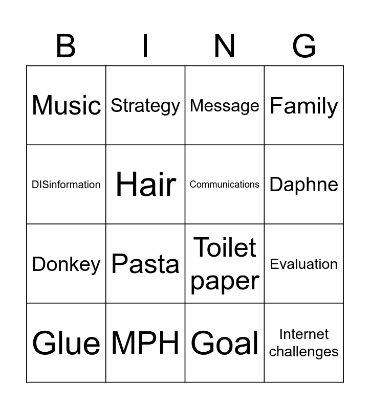 This bingo card has 38 words: Basketball, Broccoli, Car, Communications, Crayons, Daffodil, Daphne, Defense, DISinformation, Donkey, Evaluation, Family, Glue, Goal, Hair, Internet challenges, Medium, Message, MISinformation, MPH, Music, Offense, Pasta, Poison Control, Populations, Potato, Problem, Public Health, Rainbow, Research, Sailor, Slime, Soren, Strategy, Target Audience, Toaster, Toilet paper and Yoyo.