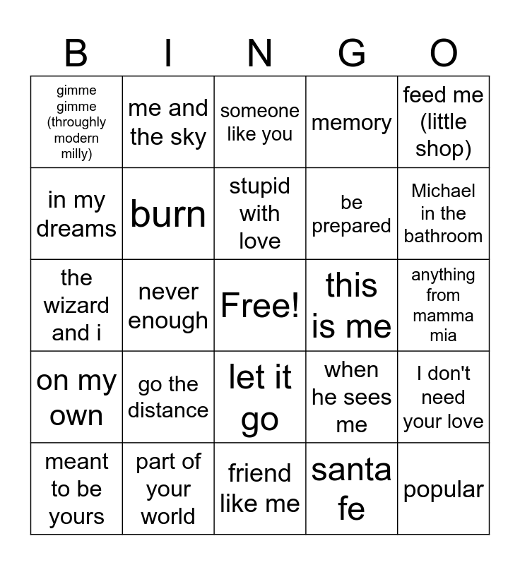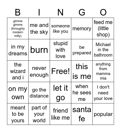 This bingo card has a free space and 29 words: meant to be yours, waiving through a window, never enough, sexy (mean girls), gimme gimme (throughly modern milly), someone like you, burn, go the distance, this is me, part of your world, anything from mamma mia, popular, friend like me, santa fe, Michael in the bathroom, you'll be back, let it go, on my own, feed me (little shop), the wizard and i, when he sees me, when will my life begin, be prepared, in my dreams, memory, me and the sky, I don't need your love, stupid with love and hopelessly devoted to you.