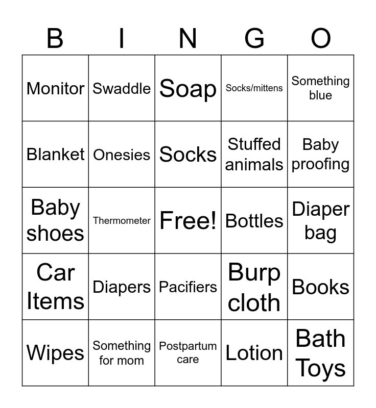 This bingo card has a free space and 24 words: Diapers, Something for mom, Socks, Wipes, Something blue, Monitor, Blanket, Swaddle, Bottles, Pacifiers, Stuffed animals, Baby shoes, Burp cloth, Books, Onesies, Lotion, Diaper bag, Soap, Baby proofing, Thermometer, Bath Toys, Car Items, Socks/mittens and Postpartum care.