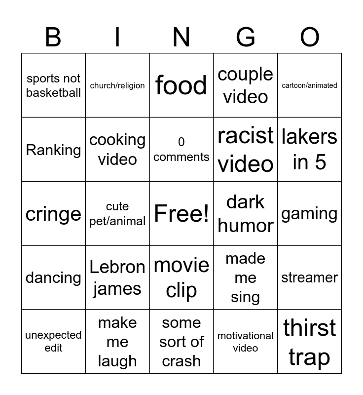This bingo card has a free space and 24 words: Lebron james, make me laugh, 0 comments, unexpected edit, cartoon/animated, sports not basketball, Ranking, church/religion, dark humor, movie clip, racist video, cringe, made me sing, streamer, cooking video, motivational video, gaming, food, lakers in 5, cute pet/animal, thirst trap, dancing, couple video and some sort of crash.