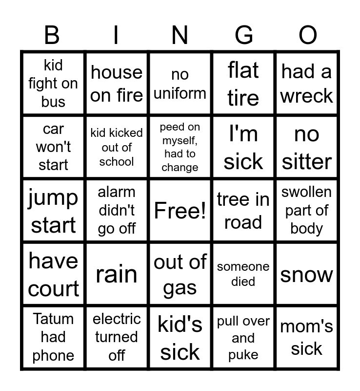 This bingo card has a free space and 24 words: rain, electric turned off, peed on myself, had to change, Tatum had phone, had a wreck, kid fight on bus, car won't start, house on fire, tree in road, out of gas, I'm sick, jump start, someone died, snow, kid kicked out of school, pull over and puke, swollen part of body, no uniform, no sitter, alarm didn't go off, mom's sick, have court, flat tire and kid's sick.