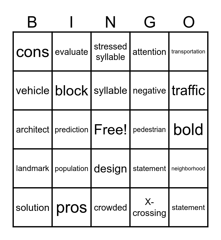 This bingo card has a free space and 24 words: population, pros, syllable, solution, transportation, cons, vehicle, evaluate, pedestrian, design, negative, architect, statement, neighborhood, block, X-crossing, bold, stressed syllable, traffic, prediction, statement, landmark, attention and crowded.