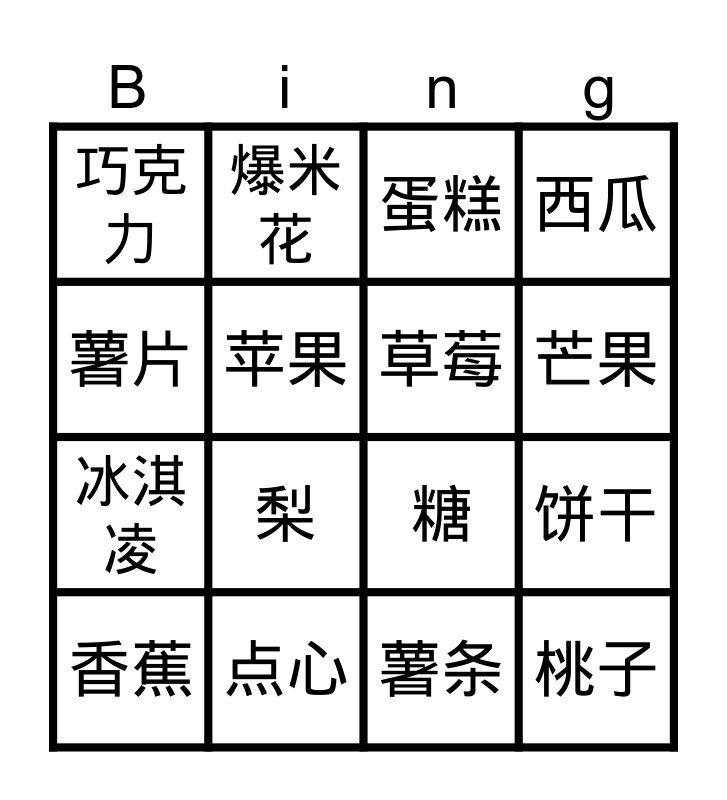 This bingo card has 16 words: 点心, 饼干, 蛋糕, 巧克力, 冰淇凌, 爆米花, 糖, 薯条, 薯片, 苹果, 香蕉, 西瓜, 梨, 芒果, 草莓 and 桃子.