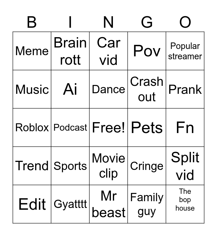 This bingo card has a free space and 24 words: Edit, Sports, Dance, Family guy, Popular streamer, Meme, Brain rott, Car vid, Pets, Fn, Roblox, Ai, Cringe, Split vid, Music, Gyatttt, Mr beast, Pov, Prank, Trend, Podcast, Movie clip, Crash out and The bop house.