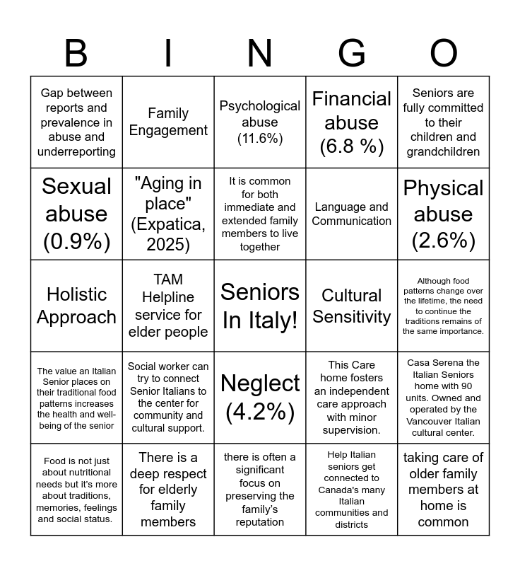 This bingo card has a free space and 24 words: Social worker can try to connect Senior Italians to the center for community and cultural support., There is a deep respect for elderly family members, It is common for both immediate and extended family members to live together, Food is not just about nutritional needs but it’s more about traditions, memories, feelings and social status. , Seniors are fully committed to their children and grandchildren, Gap between reports and prevalence in abuse and underreporting, Sexual abuse (0.9%), Family Engagement, Cultural Sensitivity, Neglect (4.2%), Language and Communication, Holistic Approach, This Care home fosters an independent care approach with minor supervision., Casa Serena the Italian Seniors home with 90 units. Owned and operated by the Vancouver Italian cultural center., "Aging in place" (Expatica, 2025), Help Italian seniors get connected to Canada's many Italian communities and districts, Although food patterns change over the lifetime, the need to continue the traditions remains of the same importance., Psychological abuse (11.6%), Physical abuse (2.6%), TAM Helpline service for elder people, taking care of older family members at home is common, The value an Italian Senior places on their traditional food patterns increases the health and well-being of the senior, Financial abuse (6.8 %) and there is often a significant focus on preserving the family’s reputation.