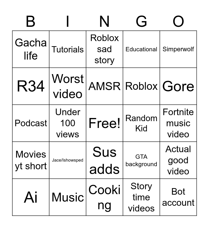 This bingo card has a free space and 24 words: Jace/Ishowsped, Music, AMSR, Ai, Simperwolf, Gacha life, R34, Tutorials, Random Kid, Sus adds, Roblox, Podcast, GTA background, Actual good video, Worst video, Story time videos, Fortnite music video, Roblox sad story, Gore, Under 100 views, Bot account, Movies yt short, Educational and Cooki ng.