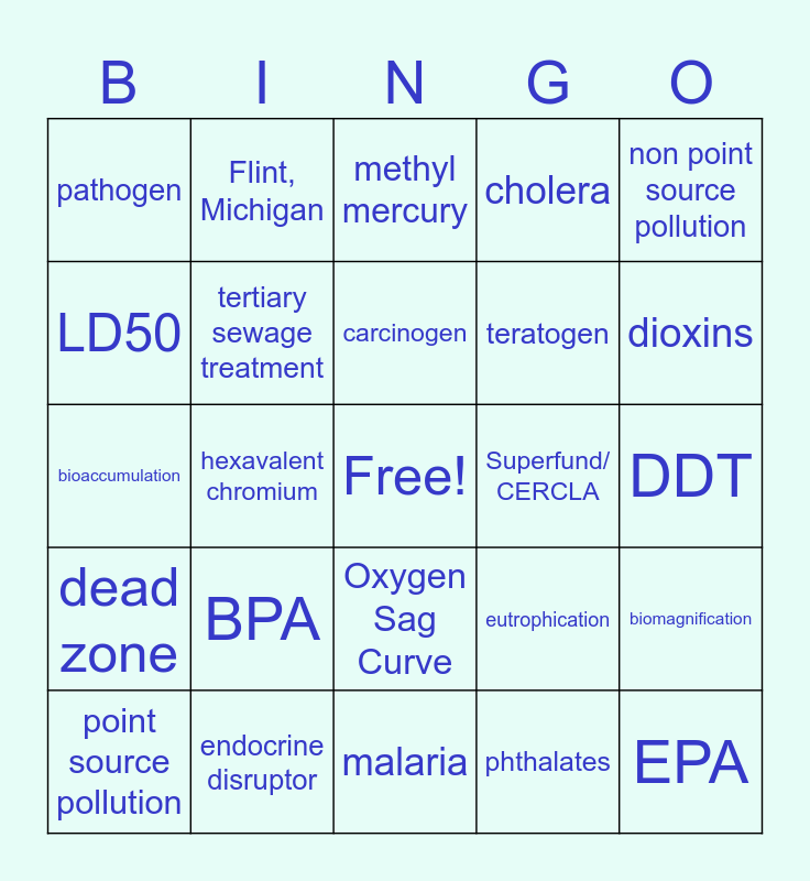 This bingo card has a free space and 24 words: BPA, endocrine disruptor, carcinogen, point source pollution, non point source pollution, pathogen, LD50, Flint, Michigan, Superfund/ CERCLA, Oxygen Sag Curve, teratogen, bioaccumulation, eutrophication, biomagnification, tertiary sewage treatment, phthalates, DDT, methyl mercury, dioxins, hexavalent chromium, EPA, dead zone, cholera and malaria.