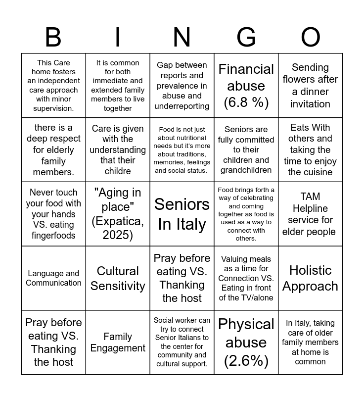 This bingo card has a free space and 24 words: Cultural Sensitivity, Family Engagement, Food is not just about nutritional needs but it’s more about traditions, memories, feelings and social status. , Pray before eating VS. Thanking the host, Sending flowers after a dinner invitation, This Care home fosters an independent care approach with minor supervision., there is a deep respect for elderly family members., It is common for both immediate and extended family members to live together, Food brings forth a way of celebrating and coming together as food is used as a way to connect with others., Pray before eating VS. Thanking the host, Seniors are fully committed to their children and grandchildren, Never touch your food with your hands VS. eating fingerfoods, Valuing meals as a time for Connection VS. Eating in front of the TV/alone, Holistic Approach, Care is given with the understanding that their childre, Physical abuse (2.6%), TAM Helpline service for elder people , Gap between reports and prevalence in abuse and underreporting, Eats With others and taking the time to enjoy the cuisine, "Aging in place" (Expatica, 2025), In Italy, taking care of older family members at home is common, Language and Communication, Financial abuse (6.8 %) and Social worker can try to connect Senior Italians to the center for community and cultural support..