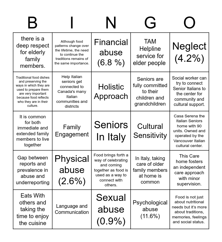 This bingo card has a free space and 24 words: Physical abuse (2.6%), Language and Communication, Holistic Approach, Eats With others and taking the time to enjoy the cuisine, Neglect (4.2%), there is a deep respect for elderly family members., Traditional food dishes and preserving the ways in which they are used to prepare them are very important because food reflects who they are in their culture., Although food patterns change over the lifetime, the need to continue the traditions remains of the same importance., Cultural Sensitivity, Food brings forth a way of celebrating and coming together as food is used as a way to connect with others., Seniors are fully committed to their children and grandchildren, It is common for both immediate and extended family members to live together, In Italy, taking care of older family members at home is common, This Care home fosters an independent care approach with minor supervision., Help Italian seniors get connected to Canada's many Italian communities and districts, Psychological abuse (11.6%), Casa Serena the Italian Seniors home with 90 units. Owned and operated by the Vancouver Italian cultural center., Financial abuse (6.8 %), Social worker can try to connect Senior Italians to the center for community and cultural support., Family Engagement, Food is not just about nutritional needs but it’s more about traditions, memories, feelings and social status. , Gap between reports and prevalence in abuse and underreporting, TAM Helpline service for elder people and Sexual abuse (0.9%).