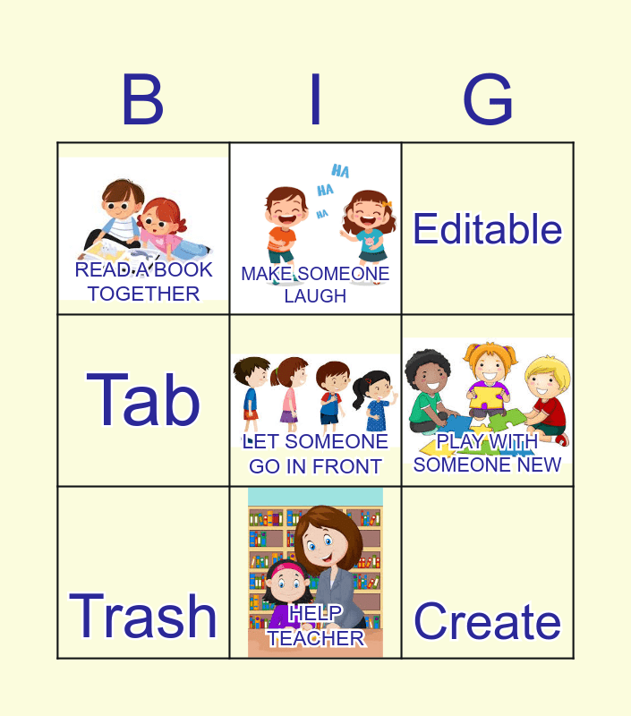 This bingo card has 10 images and 24 words: SHARE, HUG SOMEONE, HELP TEACHER, PICK UP TRASH, LET SOMEONE GO IN FRONT, READ A BOOK TOGETHER, PLAY WITH SOMEONE NEW, MAKE SOMEONE LAUGH, HELP A FRIEND, Create, Folder, Star, Folder, Trash, Upload, Open, Editable, Viewable, File, Comment, Resolve, Rename, Tab and Shortcut.