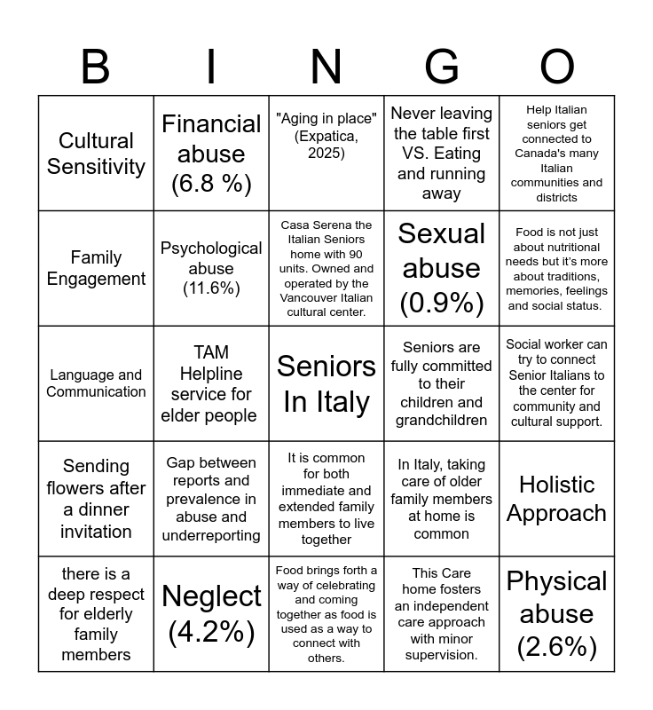 This bingo card has a free space and 24 words: Gap between reports and prevalence in abuse and underreporting, Neglect (4.2%), Casa Serena the Italian Seniors home with 90 units. Owned and operated by the Vancouver Italian cultural center., there is a deep respect for elderly family members, Help Italian seniors get connected to Canada's many Italian communities and districts, Cultural Sensitivity, Family Engagement, Financial abuse (6.8 %), Seniors are fully committed to their children and grandchildren, It is common for both immediate and extended family members to live together, Sexual abuse (0.9%), Language and Communication, In Italy, taking care of older family members at home is common, Holistic Approach, Psychological abuse (11.6%), This Care home fosters an independent care approach with minor supervision., Social worker can try to connect Senior Italians to the center for community and cultural support., "Aging in place" (Expatica, 2025) , Food is not just about nutritional needs but it’s more about traditions, memories, feelings and social status. , TAM Helpline service for elder people , Physical abuse (2.6%), Sending flowers after a dinner invitation, Never leaving the table first VS. Eating and running away and Food brings forth a way of celebrating and coming together as food is used as a way to connect with others..