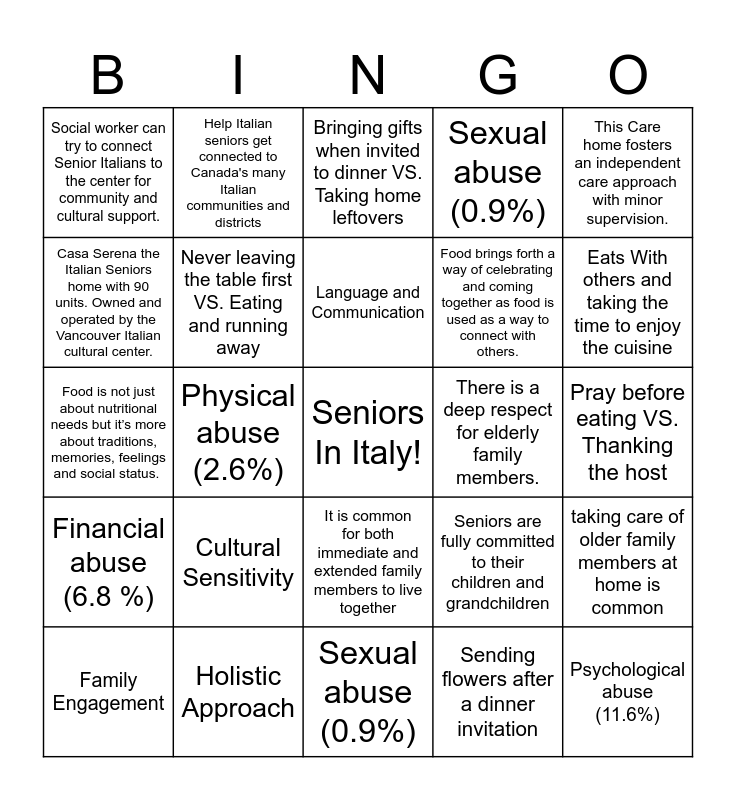 This bingo card has a free space and 24 words: Cultural Sensitivity, Holistic Approach, Language and Communication, Family Engagement, This Care home fosters an independent care approach with minor supervision., Social worker can try to connect Senior Italians to the center for community and cultural support., Casa Serena the Italian Seniors home with 90 units. Owned and operated by the Vancouver Italian cultural center., Help Italian seniors get connected to Canada's many Italian communities and districts, There is a deep respect for elderly family members., It is common for both immediate and extended family members to live together, Food brings forth a way of celebrating and coming together as food is used as a way to connect with others., Food is not just about nutritional needs but it’s more about traditions, memories, feelings and social status. , Seniors are fully committed to their children and grandchildren, taking care of older family members at home is common, Never leaving the table first VS. Eating and running away, Sending flowers after a dinner invitation, Pray before eating VS. Thanking the host, Bringing gifts when invited to dinner VS. Taking home leftovers, Eats With others and taking the time to enjoy the cuisine, Physical abuse (2.6%), Psychological abuse (11.6%), Financial abuse (6.8 %), Sexual abuse (0.9%) and Sexual abuse (0.9%).