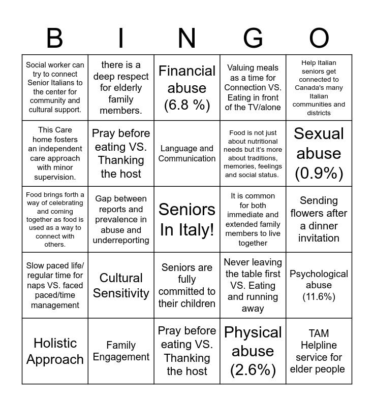 This bingo card has a free space and 24 words: Cultural Sensitivity, Family Engagement, Language and Communication, Holistic Approach, Help Italian seniors get connected to Canada's many Italian communities and districts, Social worker can try to connect Senior Italians to the center for community and cultural support., This Care home fosters an independent care approach with minor supervision., there is a deep respect for elderly family members., It is common for both immediate and extended family members to live together, Seniors are fully committed to their children, Food is not just about nutritional needs but it’s more about traditions, memories, feelings and social status. , Food brings forth a way of celebrating and coming together as food is used as a way to connect with others., Never leaving the table first VS. Eating and running away, Psychological abuse (11.6%), Pray before eating VS. Thanking the host, Physical abuse (2.6%), Sending flowers after a dinner invitation, Financial abuse (6.8 %), Sexual abuse (0.9%), Gap between reports and prevalence in abuse and underreporting, TAM Helpline service for elder people , Slow paced life/ regular time for naps VS. faced paced/time management, Valuing meals as a time for Connection VS. Eating in front of the TV/alone and Pray before eating VS. Thanking the host.
