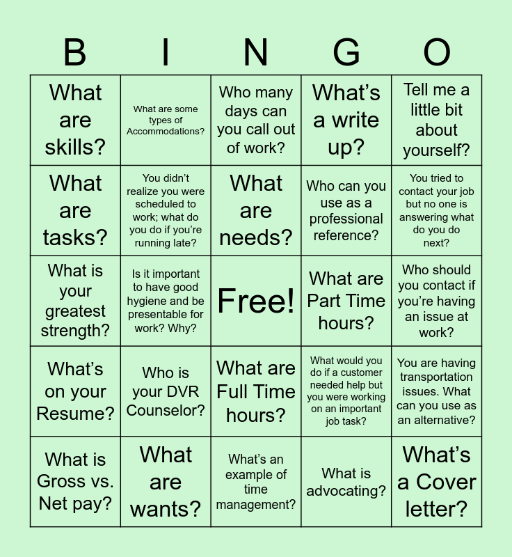 This bingo card has a free space and 24 words: Who is your DVR Counselor?, What are wants?, What are needs?, What is Gross vs. Net pay?, Tell me a little bit about yourself?, What are skills?, What are tasks?, What are some types of Accommodations?, What are Part Time hours?, What are Full Time hours?, Who can you use as a professional reference?, What is your greatest strength?, What would you do if a customer needed help but you were working on an important job task?, You are having transportation issues. What can you use as an alternative?, You didn’t realize you were scheduled to work; what do you do if you’re running late?, What is advocating?, Who should you contact if you’re having an issue at work?, Who many days can you call out of work?, You tried to contact your job but no one is answering what do you do next?, Is it important to have good hygiene and be presentable for work? Why?, What’s a Cover letter?, What’s on your Resume?, What’s a write up? and What’s an example of time management?.