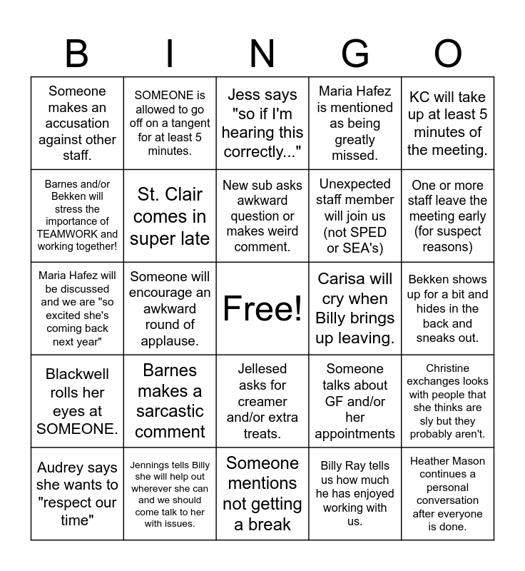 This bingo card has a free space and 24 words: Barnes makes a sarcastic comment, Jennings tells Billy she will help out wherever she can and we should come talk to her with issues., New sub asks awkward question or makes weird comment., Audrey says she wants to "respect our time", KC will take up at least 5 minutes of the meeting., Someone makes an accusation against other staff., Barnes and/or Bekken will stress the importance of TEAMWORK and working together!, SOMEONE is allowed to go off on a tangent for at least 5 minutes., Carisa will cry when Billy brings up leaving., Jellesed asks for creamer and/or extra treats., Unexpected staff member will join us (not SPED or SEA's), Maria Hafez will be discussed and we are "so excited she's coming back next year", Someone talks about GF and/or her appointments, Christine exchanges looks with people that she thinks are sly but they probably aren't., St. Clair comes in super late, Billy Ray tells us how much he has enjoyed working with us., Bekken shows up for a bit and hides in the back and sneaks out., Jess says "so if I'm hearing this correctly...", One or more staff leave the meeting early (for suspect reasons), Someone will encourage an awkward round of applause., Heather Mason continues a personal conversation after everyone is done., Blackwell rolls her eyes at SOMEONE., Maria Hafez is mentioned as being greatly missed. and Someone mentions not getting a break.