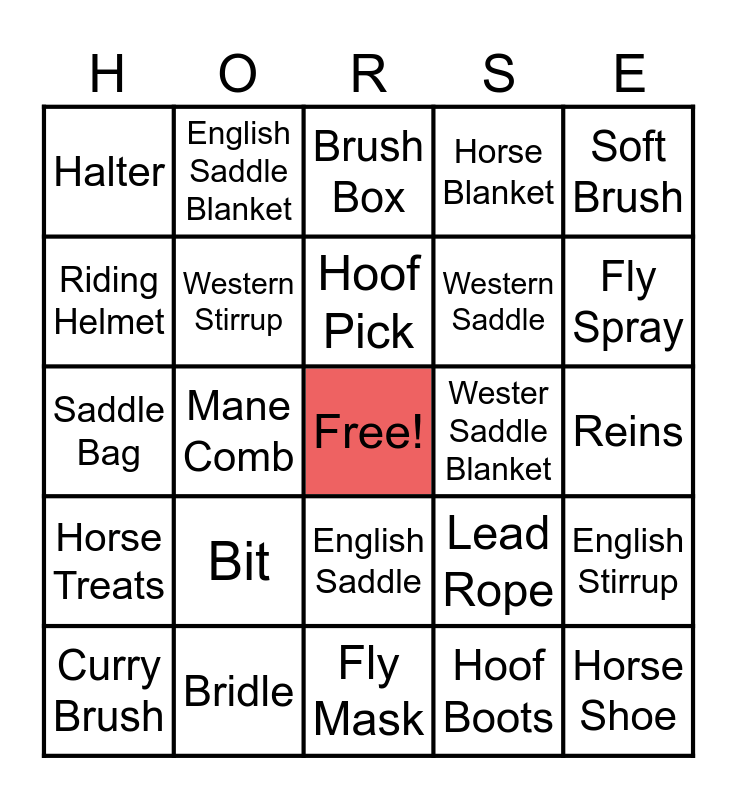 This bingo card has a free space and 24 words: Bit, Bridle, Hoof Pick, Curry Brush, Soft Brush, Halter, Riding Helmet, English Saddle Blanket, Wester Saddle Blanket, English Saddle, Western Saddle, Saddle Bag, Lead Rope, English Stirrup, Western Stirrup, Hoof Boots, Reins, Brush Box, Fly Spray, Mane Comb, Horse Shoe, Horse Treats, Horse Blanket and Fly Mask.