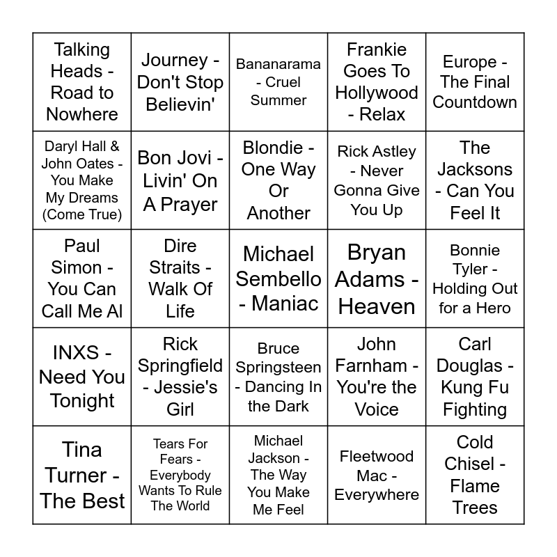 This bingo card has 64 words: a-ha - Take on Me, Cyndi Lauper - Girls Just Want to Have Fun, Eurythmics - Sweet Dreams (Are Made of This), Carl Douglas - Kung Fu Fighting, Starship - We Built This City, Van Halen - Jump - 2015 Remaster, Journey - Don't Stop Believin', Michael Jackson - Black or White, Blondie - One Way Or Another, Kim Wilde - Kids In America, Bruce Springsteen - Dancing In the Dark, George Michael - Faith, Bonnie Tyler - Holding Out for a Hero, Europe - The Final Countdown, U2 - Sweetest Thing, Daryl Hall & John Oates - You Make My Dreams (Come True), Dire Straits - Walk Of Life, Talking Heads - Road to Nowhere, Queen/David Bowie - Under Pressure, Rick Astley - Never Gonna Give You Up, Rick Springfield - Jessie's Girl, INXS - Need You Tonight, Frankie Goes To Hollywood - Relax, Pseudo Echo - Funky Town, Don Henley - The Boys Of Summer, Daryl Hall & John Oates - Maneater, TOTO - Hold the Line, Cyndi Lauper - Time After Time, Marvin Gaye - Sexual Healing, The Cars - Just What I Needed, Queen - Another One Bites The Dust, Lionel Richie - All Night Long (All Night), Irene Cara - Flashdance...What a Feeling, Tracy Chapman - Fast Car, The Jacksons - Can You Feel It, Tina Turner - The Best, Guns N' Roses - Sweet Child O' Mine, Fleetwood Mac - Everywhere, New Order - Blue Monday, Bon Jovi - Livin' On A Prayer, Paul Simon - You Can Call Me Al, Bryan Adams - Heaven, Huey Lewis & The News - The Power Of Love, Ray Parker Jr. - Ghostbusters, Kate Bush - Wuthering Heights, Michael Sembello - Maniac, Tears For Fears - Everybody Wants To Rule The World, Cold Chisel - Flame Trees, John Farnham - You're the Voice, The Police - Roxanne, Foreigner - Cold as Ice, Whitney Houston - I Wanna Dance with Somebody (Who Loves Me), Michael Jackson - The Way You Make Me Feel, Men At Work - Down Under, Run–D.M.C. - It's Like That, Toni Basil - Mickey, Bananarama - Cruel Summer, Dexys Midnight Runners - Come On Eileen, U2 - I Still Haven't Found What I'm Looking For, The Clash - Should I Stay or Should I Go, Beastie Boys - Fight For Your Right, AC/DC - Back In Black, Kenny Loggins - Danger Zone and Matthew Wilder - Break My Stride.