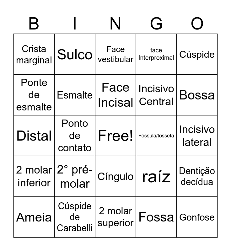 This bingo card has a free space and 24 words: 2° pré-molar, Cúspide de Carabelli, Face Incisal, Ameia, Cúspide, Crista marginal, Ponte de esmalte, Sulco, Fóssula/fosseta, Cíngulo, Incisivo Central, Distal, raíz, Dentição decídua, Esmalte, Fossa, Incisivo lateral, Face vestibular, Bossa, Ponto de contato, Gonfose, 2 molar inferior, face Interproximal and 2 molar superior.
