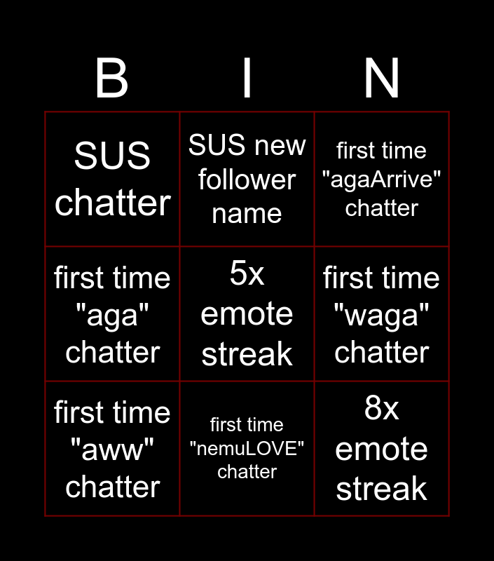 This bingo card has a free space and 8 words: first time "waga" chatter, first time "agaArrive" chatter, SUS new follower name, first time "aww" chatter, SUS chatter, 8x emote streak, first time "aga" chatter and first time "nemuLOVE" chatter.