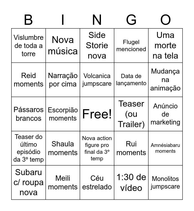 This bingo card has a free space and 24 words: Shaula moments, Meili moments, Volcanica jumpscare, Subaru c/ roupa nova, Uma morte na tela, Vislumbre de toda a torre, Reid moments, Nova música, Teaser (ou Trailer), Nova action figure pro final da 3º temp, Data de lançamento, Pássaros brancos, Rui moments, Amnésiabaru moments, Narração por cima, 1:30 de vídeo, Anúncio de marketing, Side Storie nova, Mudança na animação, Escorpião moments, Monolitos jumpscare, Teaser do último episódio da 3º temp, Flugel mencioned and Céu estrelado.