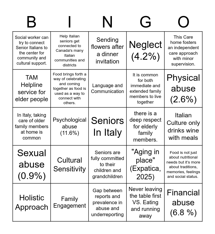 This bingo card has a free space and 24 words: Cultural Sensitivity, Family Engagement, Language and Communication, Holistic Approach, This Care home fosters an independent care approach with minor supervision., Social worker can try to connect Senior Italians to the center for community and cultural support., TAM Helpline service for elder people, Help Italian seniors get connected to Canada's many Italian communities and districts, there is a deep respect for elderly family members., Seniors are fully committed to their children and grandchildren, It is common for both immediate and extended family members to live together, In Italy, taking care of older family members at home is common, "Aging in place" (Expatica, 2025), Food is not just about nutritional needs but it’s more about traditions, memories, feelings and social status. , Food brings forth a way of celebrating and coming together as food is used as a way to connect with others., Never leaving the table first VS. Eating and running away, Italian Culture only drinks wine with meals, Sending flowers after a dinner invitation, Physical abuse (2.6%), Psychological abuse (11.6%), Financial abuse (6.8 %), Sexual abuse (0.9%), Neglect (4.2%) and Gap between reports and prevalence in abuse and underreporting.