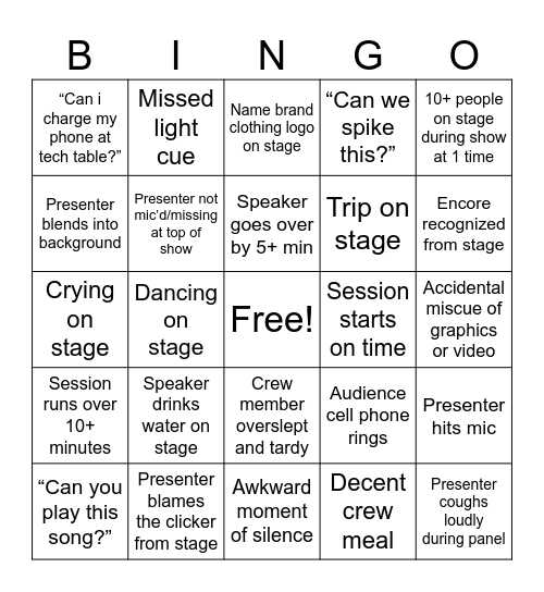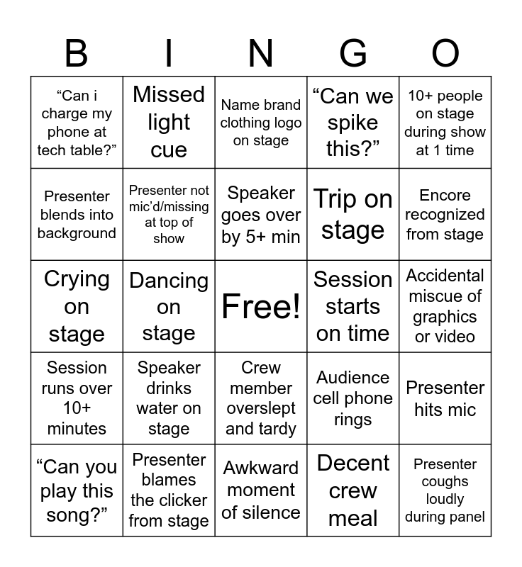 This bingo card has a free space and 36 words: Session ends early, Presenter leaves room with mic on (after show), During show prompter change, Presenter not mic’d/missing at top of show, Audience cell phone rings, Session runs over 10+ minutes, Speaker goes over by 5+ min, Banquet drops something loud, 10+ people on stage during show at 1 time, Com left open, Dancing on stage, “Can we spike this?”, Mispronounced name on stage, Session starts on time, Encore recognized from stage, “Can i charge my phone at tech table?”, Hi-five on stage, Speaker drinks water on stage, Presenter coughs loudly during panel, Name brand clothing logo on stage, Accidental miscue of graphics or video, Presenter hits mic, Presenter blames the clicker from stage, “Can you play this song?”, Awkward moment of silence, Missed light cue, Crying on stage, Inappropriate imag shot, Trip on stage, Presenter blends into background, “I have an update”, OT, Decent crew meal, Crew member overslept and tardy, Tech caught sleeping and “What is left on the timer?”.