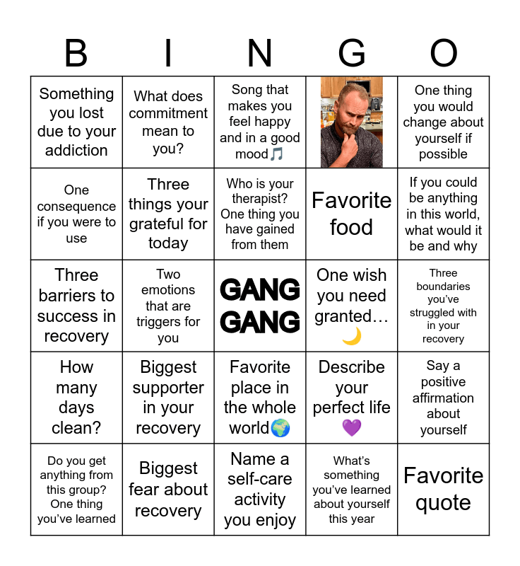 This bingo card has 1 images, a free space and 28 words: Do you get anything from this group? One thing you’ve learned, How long were you in active addiction, Two emotions that are triggers for you, Describe person to your right in one word, Something you lost due to your addiction, Song that makes you feel happy and in a good mood🎵, Three things your grateful for today, Biggest supporter in your recovery, One wish you need granted…🌙, Biggest fear about recovery, Three boundaries you’ve struggled with in your recovery, Favorite quote, Name a self-care activity you enjoy, What’s something you’ve learned about yourself this year, If you could be anything in this world, what would it be and why, Which recovery tools have been most helpful, Favorite place in the whole world🌍, How many days clean?, One thing you would change about yourself if possible, Three barriers to success in recovery, Describe your perfect life💜, Three things you are good at doing, Favorite food, One consequence if you were to use, What does commitment mean to you?, Say a positive affirmation about yourself, Who is your therapist? One thing you have gained from them and Do you trust yourself?.