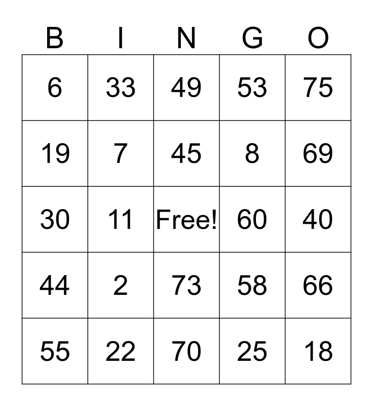 This bingo card has a free space and 24 words: 2, 22, 45, 55, 75, 6, 19, 33, 60, 73, 8, 30, 58, 66, 7, 25, 40, 49, 69, 11, 18, 44, 53 and 70.