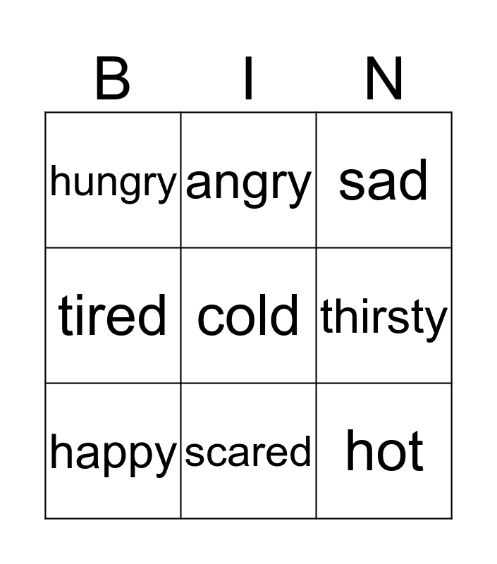 This bingo card has 9 words: happy, sad, angry, tired, hungry, thirsty, cold, hot and scared.