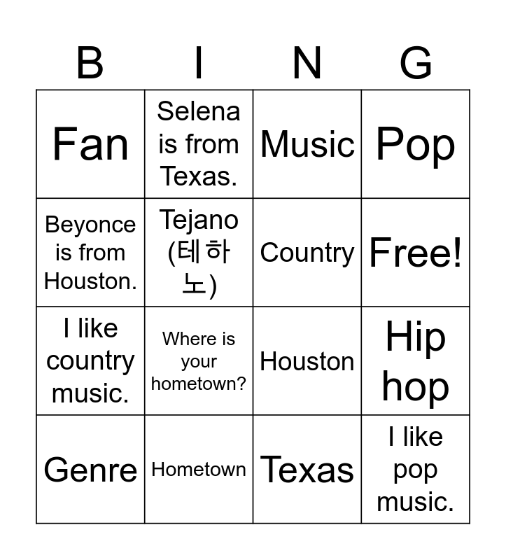This bingo card has 17 words: Texas, Genre, Music, Fan, Where is your hometown?, Pop, Hip hop, Country, Free!, Tejano (테하노), Hometown, Houston, Beyonce is from Houston., Selena is from Texas., I like country music., I am a hip hop fan. and I like pop music..