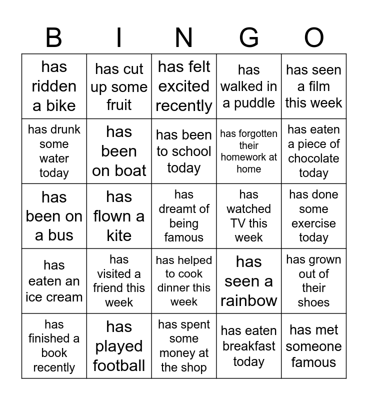 This bingo card has 30 words: has played football, has held a worm, has flown a kite, has grown out of their shoes, has ridden a bike, has felt excited recently, has been on boat, has helped to cook dinner this week, has watched TV this week, has spent some money at the shop, has done some exercise today, has dreamt of being famous, has eaten breakfast today, has met someone famous, has eaten a piece of chocolate today, has helped out at home this week, has seen a rainbow, has eaten an ice cream, has visited a friend this week, has seen a film this week, has been on a bus, has fallen over recently, has cut up some fruit, has forgotten their homework at home, has drunk some water today, has walked in a puddle, has grown out of their shoes, has finished a book recently, has been to school today and has helped to cook dinner this week.