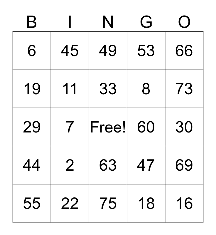 This bingo card has a free space and 24 words: 2, 22, 33, 55, 66, 6, 19, 45, 60, 63, 8, 29, 47, 69, 11, 18, 30, 49, 73, 7, 16, 44, 53 and 75.