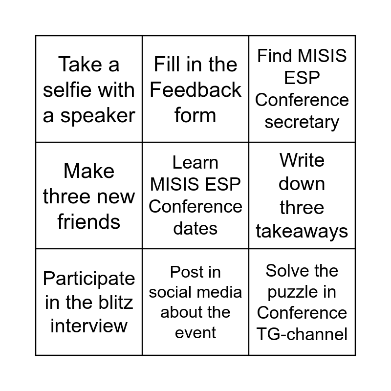 This bingo card has 9 words: Participate in the blitz interview, Find MISIS ESP Conference secretary, Fill in the Feedback form, Make three new friends, Take a selfie with a speaker, Write down three takeaways, Learn MISIS ESP Conference dates, Solve the puzzle in Conference TG-channel and Post in social media about the event.