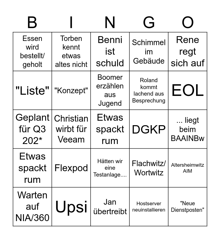 This bingo card has 25 words: Flexpod, Jan übertreibt, Boomer erzählen aus Jugend, Warten auf NIA/360, Rene regt sich auf, Essen wird bestellt/ geholt, "Liste", Torben kennt etwas altes nicht, DGKP, Hätten wir eine Testanlage...., Roland kommt lachend aus Besprechung, Geplant für Q3 202*, Flachwitz/ Wortwitz, Altersheimwitz AIM, "Konzept", "Neue Dienstposten", ... liegt beim BAAINBw, Benni ist schuld, EOL, Christian wirbt für Veeam, Etwas spackt rum, Upsi, Etwas spackt rum, Schimmel im Gebäude and Hostserver neuinstallieren.